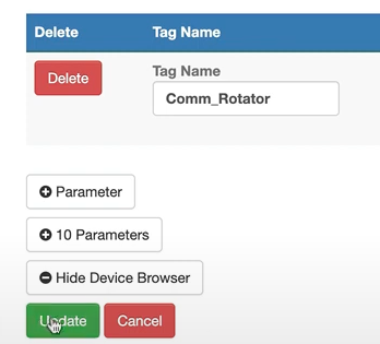 For this example, the ‘Comm_Rotator’ tag is selected by clicking the button on the last column of the Parameters table, labeled ‘Select’. This will open the tag in the table currently displaying ‘No Parameters Selected’.